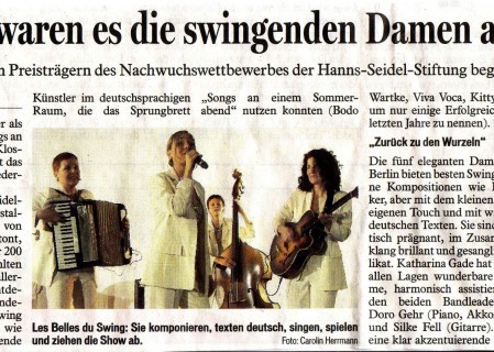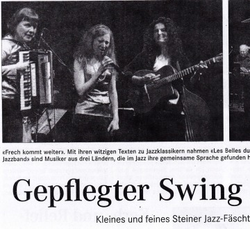 „In vielerlei Hinsicht waren «Les Belles du Swing» der Leckerbissen des Abends. Das Quintett aus Berlin ist frech, verspielt und (….) mit dem Mut zur Kombination aus Alt und Neu(…)